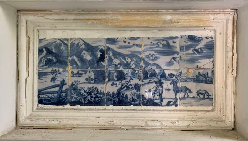 Het tegeltableau in de vestibule. De omgeving is afgebeeld voor de bouw van Duinwijk. Aan de rechterzijde is de Hargervaart zichtbaar. De duinen op de achtergrond groots afgebeeld en op de voorgrond een heerschap die een Goudse pijp rookt.